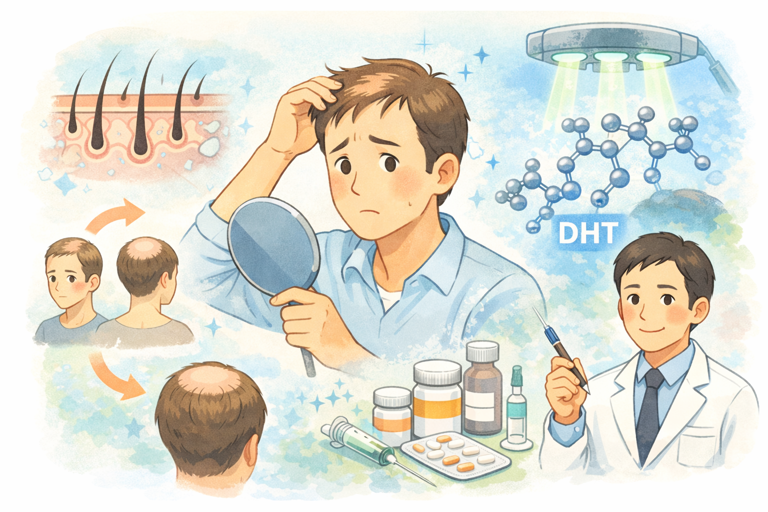 AGA治療の基本となるのが内服薬による治療です。AGAの主な原因である男性ホルモン「DHT(ジヒドロテストステロン)」の生成を抑制することで、薄毛の進行を食い止め、ヘアサイクルの正常化を促します。